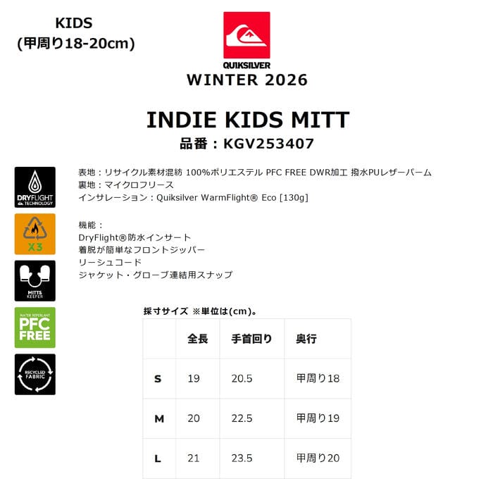 ・QUIKSILVERジャケットと連結可能なスナップボタンを併用すれば、休憩中にグローブを無くす心配もありません。特長表地:リサイクル素材混紡 100%ポリエステル PFC FREE DWR加工