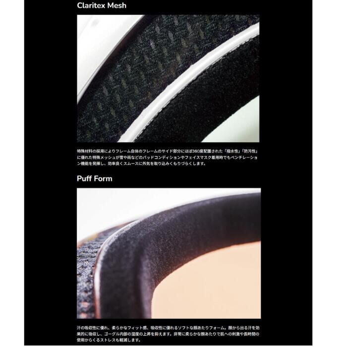 レンズは太陽光の強さに合わせて最適な視認性を確保する調光タイプです。またプレミアムアンチフォグにより曇りにくく快適な視界を保ちます。スペック・Photochromic Lens(調光レンズ)