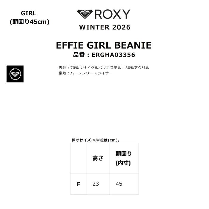 ROXY EFFIE GIRL BEANIE ERGHA03356 キッズ ビーニー 頭回り45cm ポンポン 折り返し ハーフフリースライナー ロゴ ニットキャップ スノーボード ロキシー 正規品