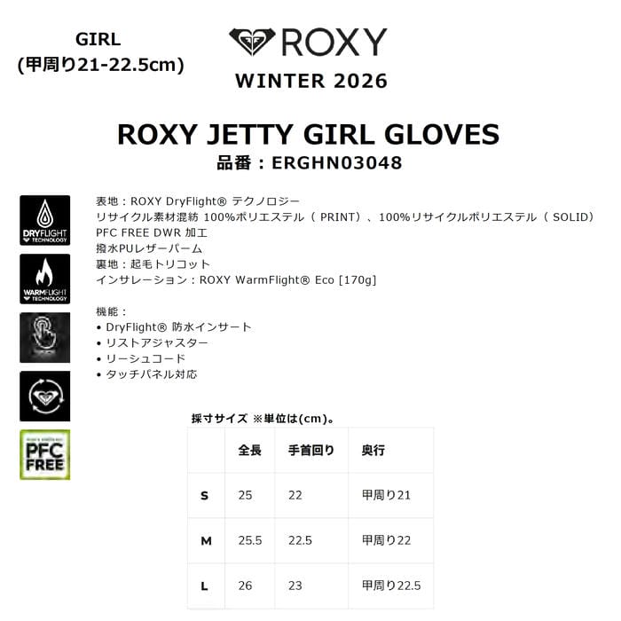 ・人差し指はタッチパネル対応で、グローブを付けたままスマホやタブレットの操作が可能です。特長表地:ROXY DryFlight テクノロジー