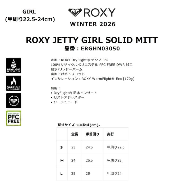 ROXY ROXY JETTY GIRL SOLID MITT ERGHN03050 キッズ スノーミトングローブ 甲周り22.5-24cm 防水 10000mm撥水 リーシュコード スノーボード ロキシー 正規品
