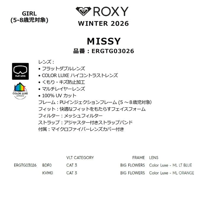 ROXY MISSY ERGTG03026 キッズ スノーゴーグル 5-8歳対象 フラットダブル ハイコントラストレンズ くもり・キズ防止加工 メッシュフィルター ロキシー 正規品