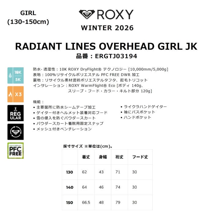 ・サイドには大きなファスナーが付いており、脱ぎ着がスムーズに行えます。特長防水? 透湿性:10K ROXY DryFlight テクノロジー [10,000mm/5,000g]