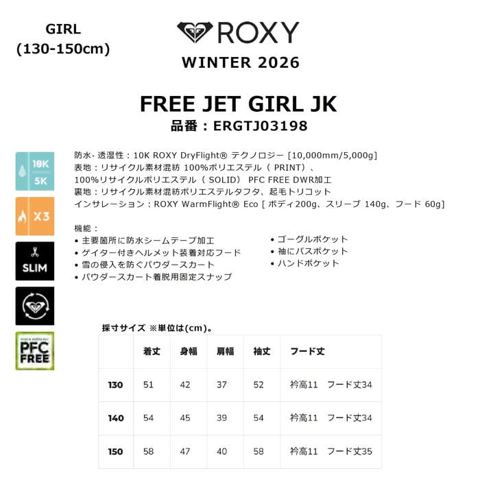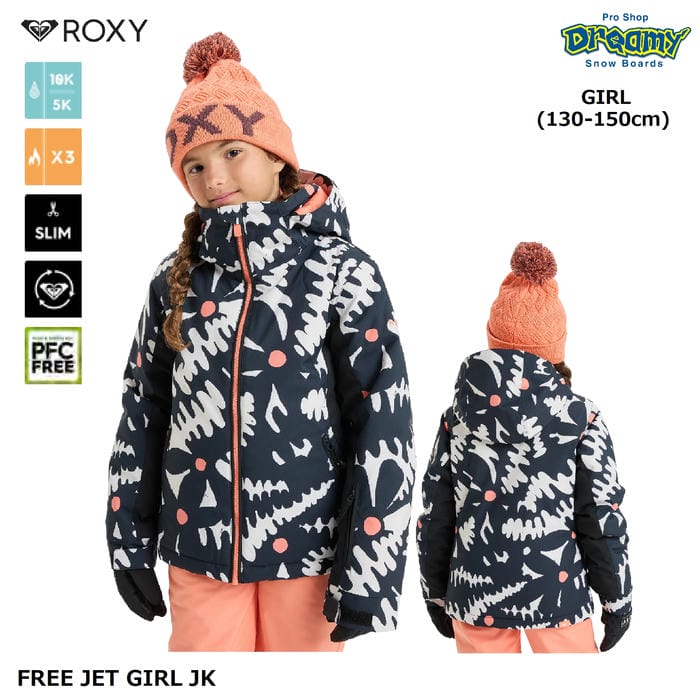 ROXY FREE JET GIRL JK ERGTJ03198 キッズ スノージャケット 130-150cm スリムフィット 防水 撥水 起毛裏地 ヘルメット対応フード パスポケット ロキシー 正規品