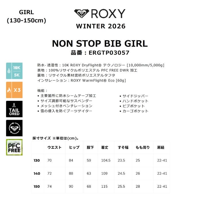 ・収納力抜群のビブポケットを備え、身長に応じてサイズ調節が可能なサスペンダー付きです。特長防水? 透湿性:10K ROXY DryFlight テクノロジー [10,000mm/5,000g]