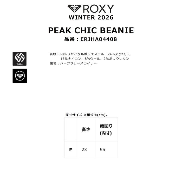 ROXY PEAK CHIC BEANIE ERJHA04408 ビーニー ダブルレイヤー ウール混 ハーフフリースライナー裏地 折り返し ポンポン ロゴ スノーボード ロキシー 正規品