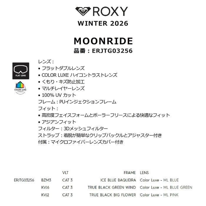 ROXY MOONRIDE AF ERJTG03256 スノーゴーグル アジアンフィット フラットダブル マルチレイヤーレンズ フレーム有り くもり・キズ防止加工 ロゴ ロキシー 正規品