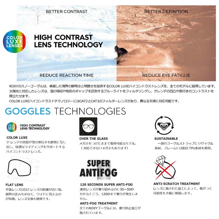 ・レンズには、鮮明な視界をもたらすCOLOR LUXEハイコントラストレンズを採用し、形状は視野の歪みが少ない平面レンズを使用しています。