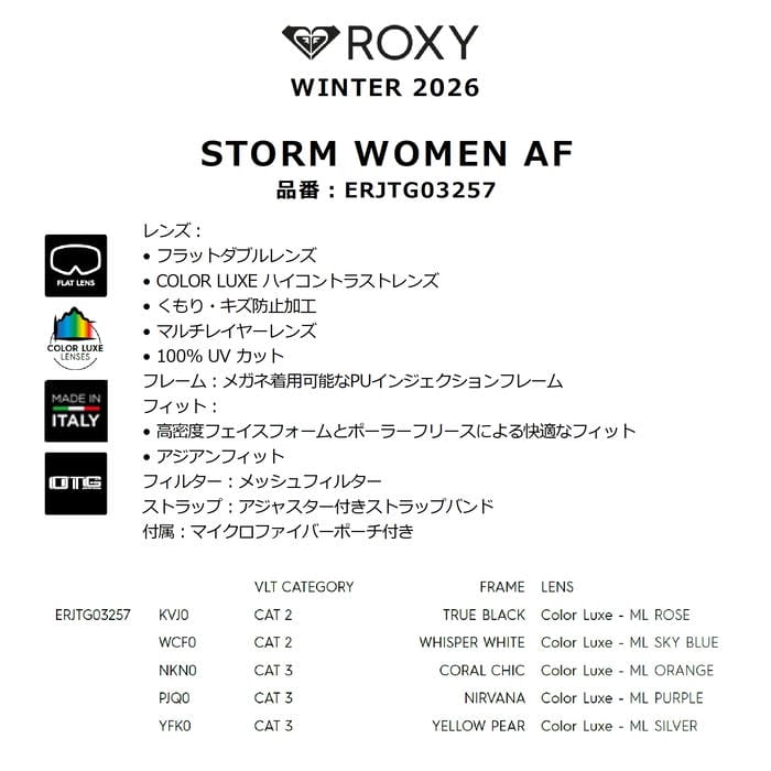 ROXY STORM WOMEN AF ERJTG03257 スノーゴーグル アジアンフィット メガネ装着可能 フラットダブル マルチレイヤーレンズ フレーム有り ロキシー 正規品