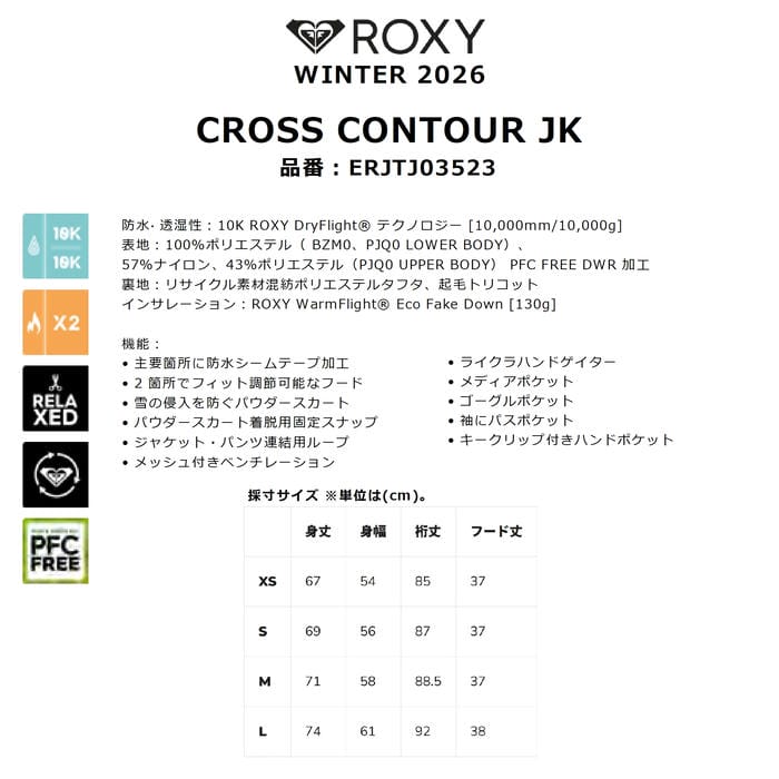 ・しなやかな素材を使用したリラックスフィットで、すっきりとしたシルエットを実現します。特長防水? 透湿性:10K ROXY DryFlight テクノロジー [10,000mm/10,000g]
