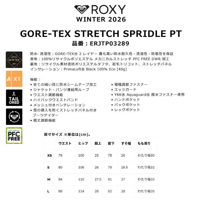 ROXY GORE-TEX STRETCH SPRIDLE PT ERJTP03289 スノーパンツ テイラードフィット ゴアテックス 防水 防風 撥水 起毛裏地 裾丈/裾幅調節 ロゴ ロキシー 正規品