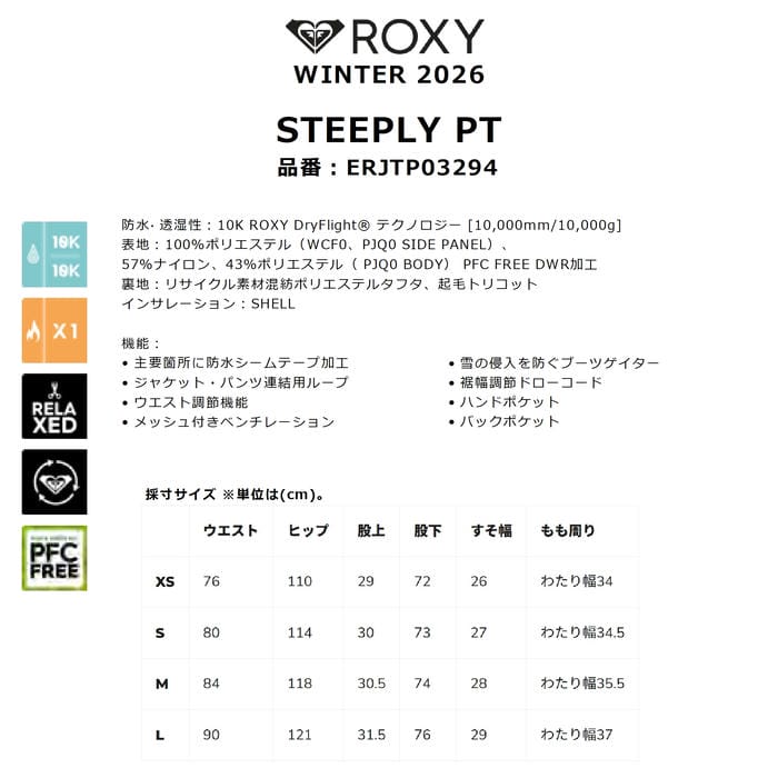 ・PJQ0カラーは、異なる質感のナイロンとポリエステル素材を組み合わせた、ユニークなコンビネーションが特徴です。特長防水? 透湿性:10K ROXY DryFlight テクノロジー [10,000mm/10,000g]
