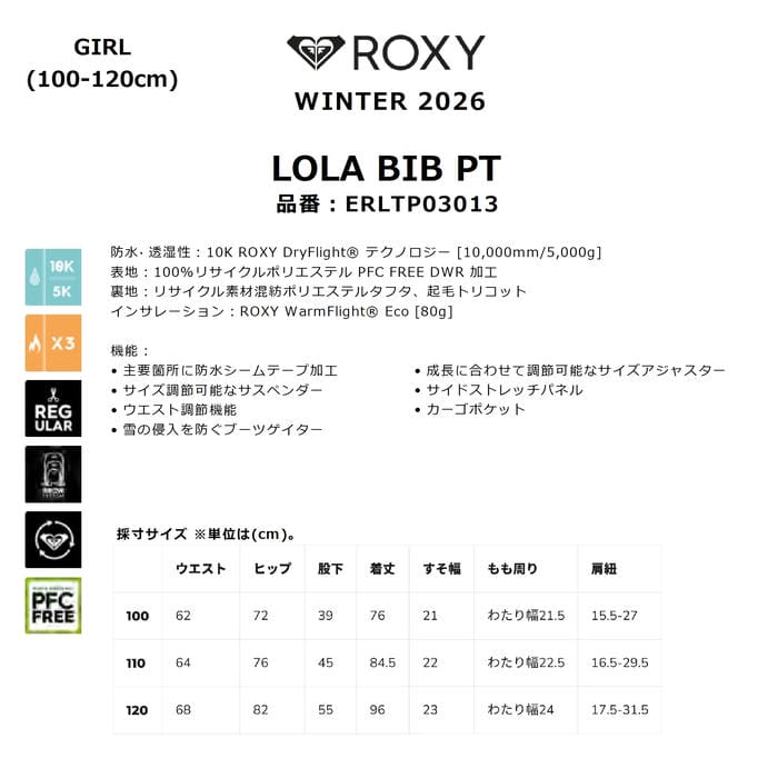 ROXY LOLA BIB PT ERLTP03013 キッズ スノービブパンツ 100-120cm レギュラーフィット 防水 撥水 サイズアジャスター カーゴポケット ロゴ ロキシー 正規品