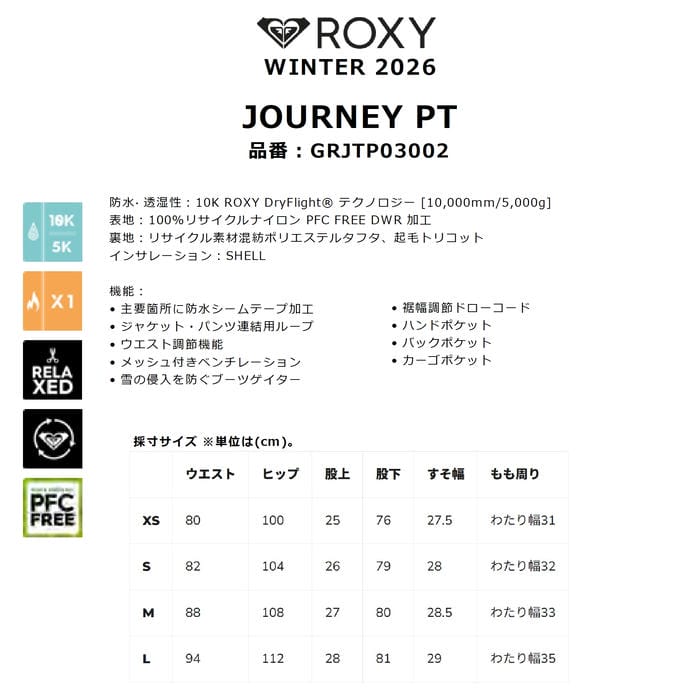 ROXY JOURNEY PT GRJTP03002 スノーパンツ リラックスフィット 防水 撥水 起毛裏地 ウエスト/裾幅調節 カーゴポケット ベンチレーション ロゴ ロキシー 正規品