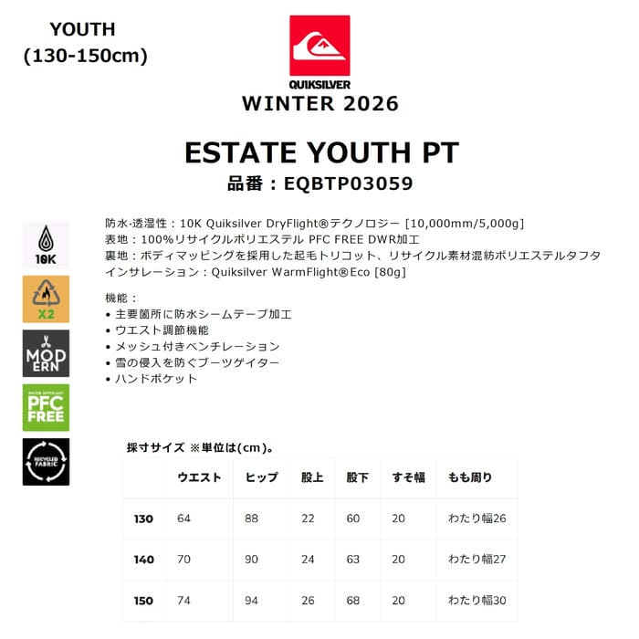 QUIKSILVER ESTATE YOUTH PT EQBTP03059 キッズ スノーパンツ 130-150cm モダンフィット 防水 撥水 起毛裏地 ウエスト調節 ロゴ クイックシルバー 正規品