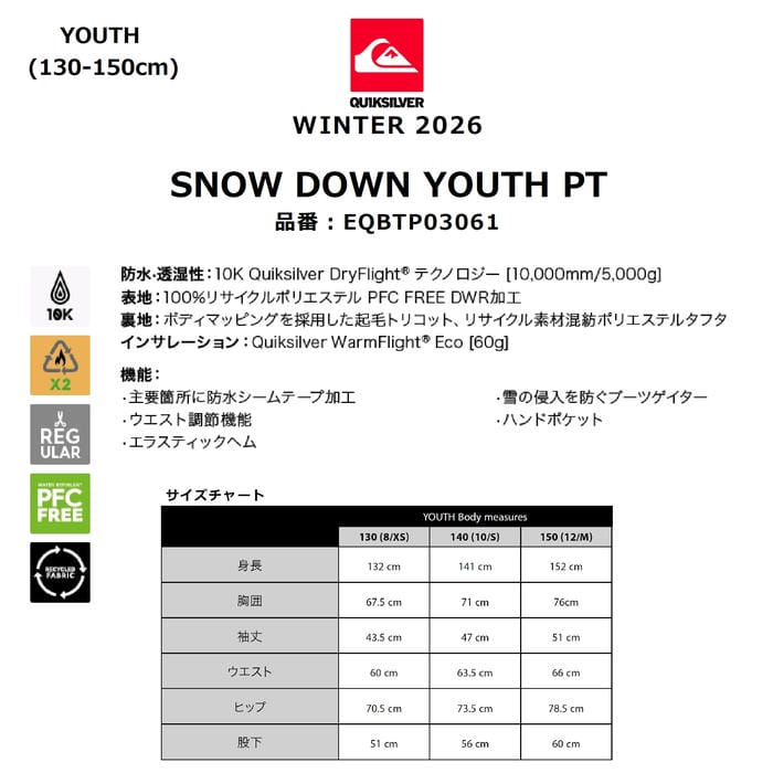定価:18000+(税)サイズ130 , 140 , 150カラーKVJ0特長防水?透湿性:10K Quiksilver DryFlightテクノロジー [10,000mm/5,000g]