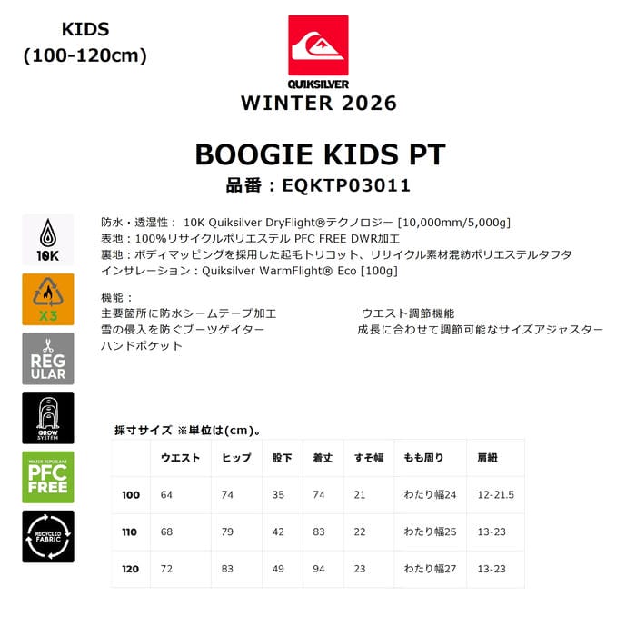 ・パンツの内側には、成長に合わせて着丈調節が可能なサイズアジャスターが付いています。特長防水・透湿性: 10K Quiksilver DryFlightテクノロジー [10,000mm/5,000g]