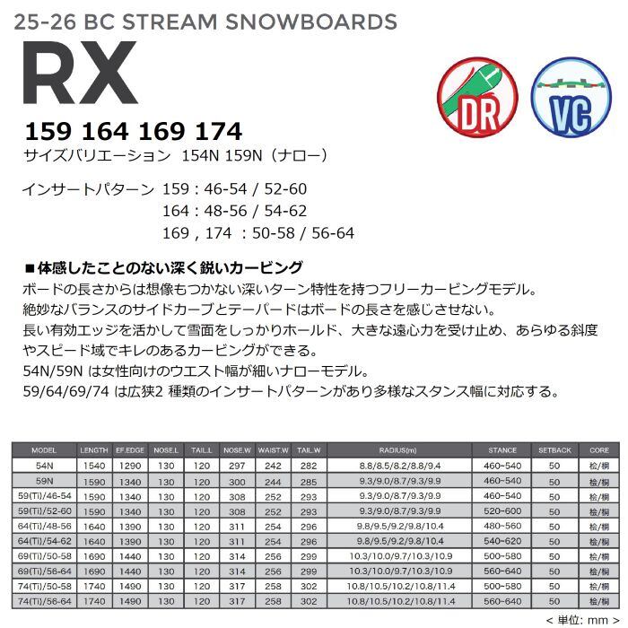 25-26 BC STREAM RX 159/164 ディレクショナル バリアブルキャンバー カービング ビーシーストリーム アールエックス 国産 スノーボード 板 正規品