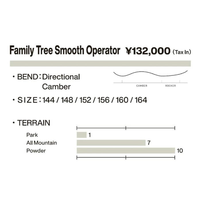 定価:120000+(税)モデルSmoothOperatorサイズ156概要オールマウンテン/パウダー スノーボード。 スピードと優れたレスポンス、抜群の浮力で、深雪でも攻めのライディングを楽しめます。