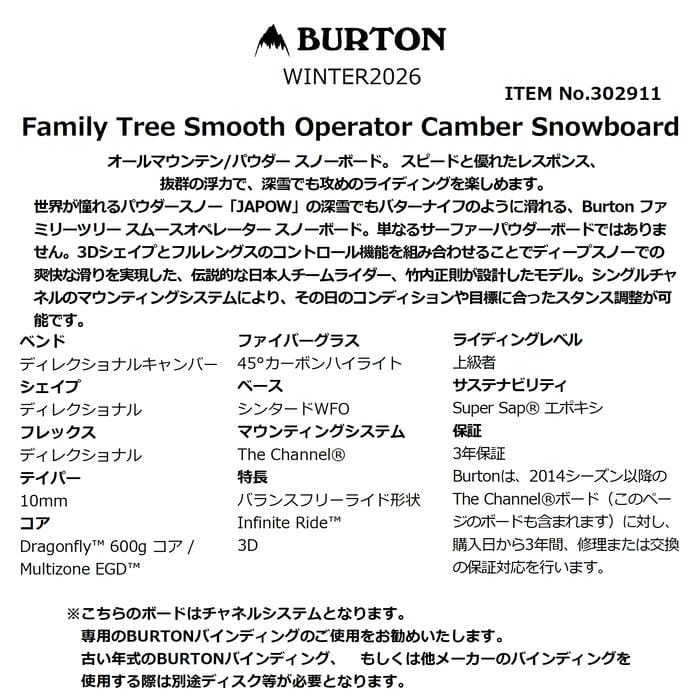 3年保証 Burtonは、2014シーズン以降のThe Channelボード(このページのボードも含まれます)に対し、購入日から3年間、修理または交換の保証対応を行います。※注意事項●返品について●
