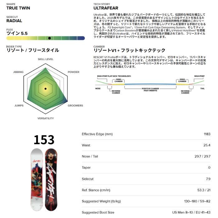 25-26 CAPITA ULTRAFEAR ウルトラフィアキャンバー ツイン 超軽量ウッドコア オールラウンド パーク キャピタ スノーボード 板 正規品