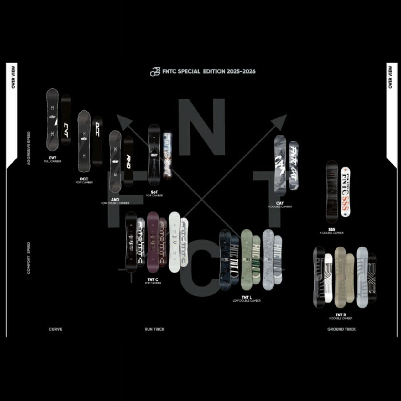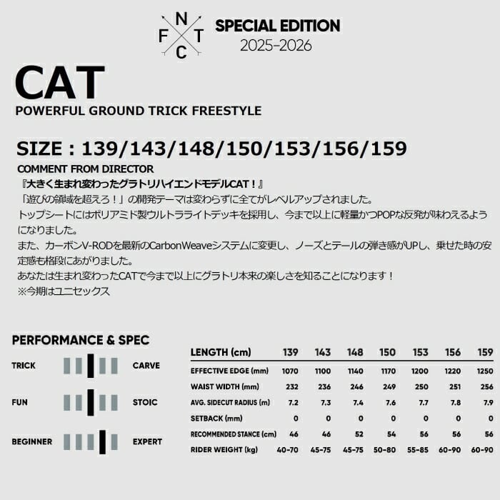 25-26 FNTC エフエヌティーシー CAT ダブルキャンバーモデル グラトリ カービング ミドルフレックス 超軽量 カーボン スノーボード 板 2026
