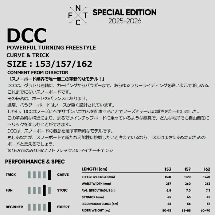 定価:85000+(税)モデルDCCサイズ153 , 157概要「スノーボード業界で唯一無二の革新的なモデル!」