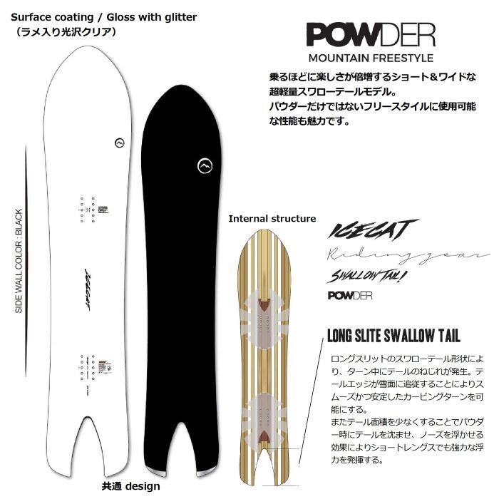 定価:110000+(税)モデルICECATサイズ149概要ショート&ワイドボディーの遊びやすいスワローテールモデル。短くても浮力たっぷりなノーズロッカーを採用し、ショートレングスでも快適かつスピード感のあるパウダーランを可能にします。またタイトなツリーランでも抜群の操作性を発揮します。さらに圧雪バーンでもスワローテールによる粘りのあるテールエッジグリップによって高速時においてもスムーズかつ強力なカービングターンを可能にします。とにかく軽快に動き回れるショートレングスサイズはパウダー時はもちろん地形遊びやフリーランにおいても遊び心をくすぐる斬新なスタイルを生み出します。取り回しに縛られない雪山を遊びまくるためのパウダーモデルです。