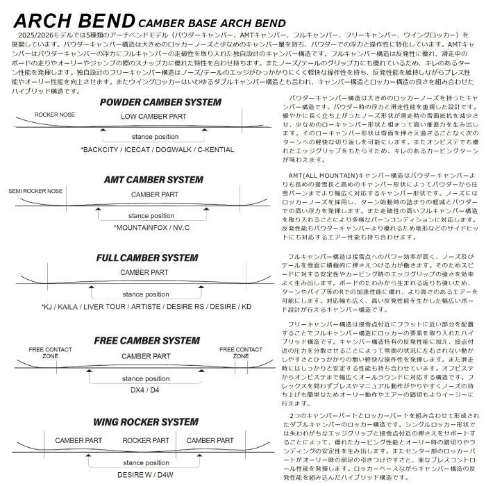 シェイプは若干幅広に変更し、ジャンプでの着地やターンの安定性を向上。ドラグリスクなども軽減します。またノーズ、テールのスクエア形状を強めることでエッジグリップを向上させ、ターンやトリックのきっかけを作りやすくアップグレードしました。サイドカーブは複合サイドカット(7R)を採用し、スムーズなターン弧を描くことが可能です。また幅広になった分、前モデルよりサイドカーブのRを全体的に小さめに調整し、安定感はそのままにワイドボードにありがちなルーズな操作性を解消。ジブやグラトリ等の細かい操作や、素直でクイックな切替しも快適に行えます。構成材では超高強度ポリエチレンリボン2本をX字配置から、1本の縦配置に変更。軽量化を図るとともに、ボード中心にフレックスの芯を集中させることでトーションを使い易くし操作性の向上に成功しました。グラス補強材にはHIGH POWER CARBON STRINGを新たに採用。従来のグラス補強材にカーボン繊維を加え、縦に織り込むことで反発性能をUP。POP感が増したことでよりハイエアー、高回転スピンに挑戦できます。また2x6のバーサタイルインサートホールを採用している為、フリーライディングに対応するセットバックポジションや、多彩なスタンスワイドに調整が可能となり、パウダーからパークライドまで幅広いライディングスタイルに対応可能です。