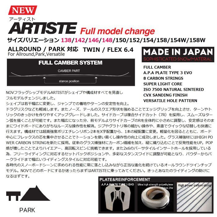 定価:99800+(税)モデルARTISTEサイズ148概要NOVフラッグシップモデルARTISTがシェイプや構成材すべてを見直しフルモデルチェンジしました。