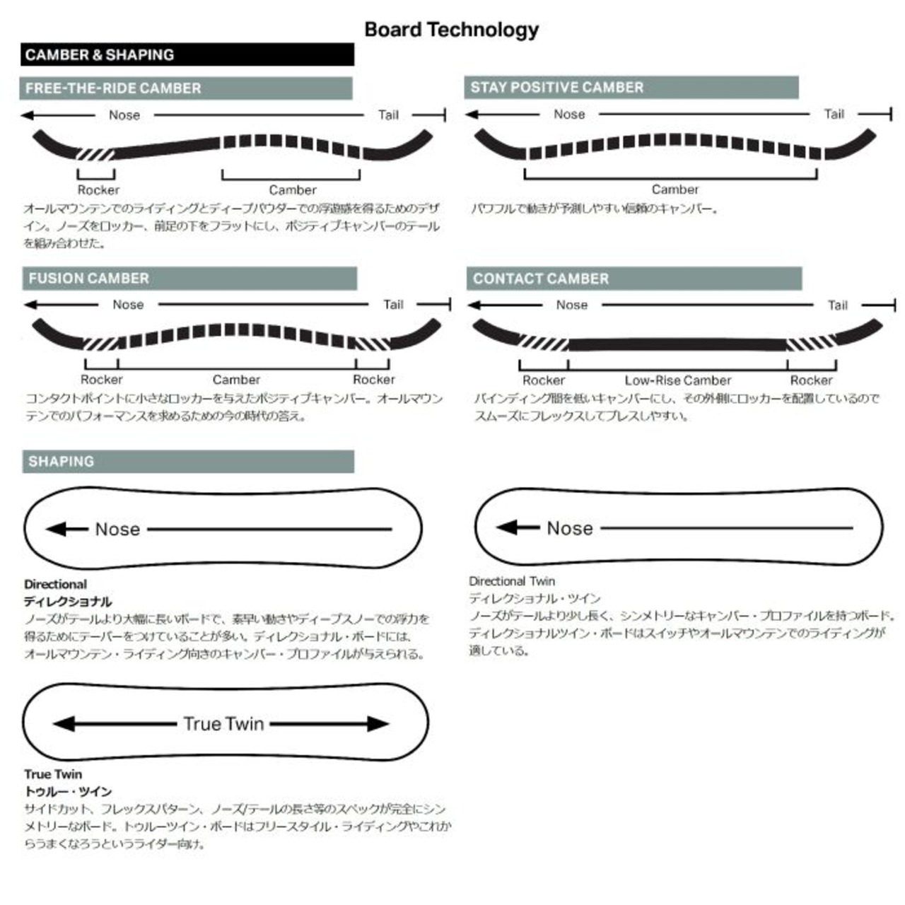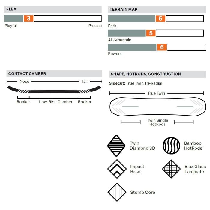 ソフトなフレックス・プロファイルでプレス性能に優れ、トリックとターンのどちらも上達したいボードを求めるライダーのニュースタンダード。ノーズとテールのホットロッドが安定感を高め、ツイン・ダイアモンド3D シェイプが楽しいライディングを約束する。構造コンタクトキャンバー