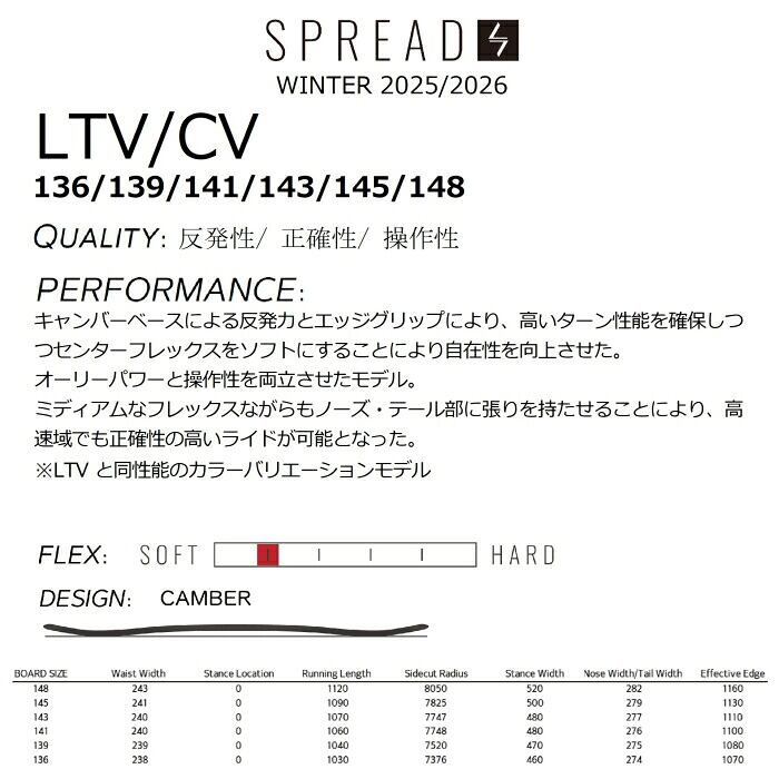 25-26 SPREAD スプレッド LTV/CV 143 キャンバーモデル フリーラン スノーボード 尾川慎二 板 グラトリ レッツトライ レディース 正規品