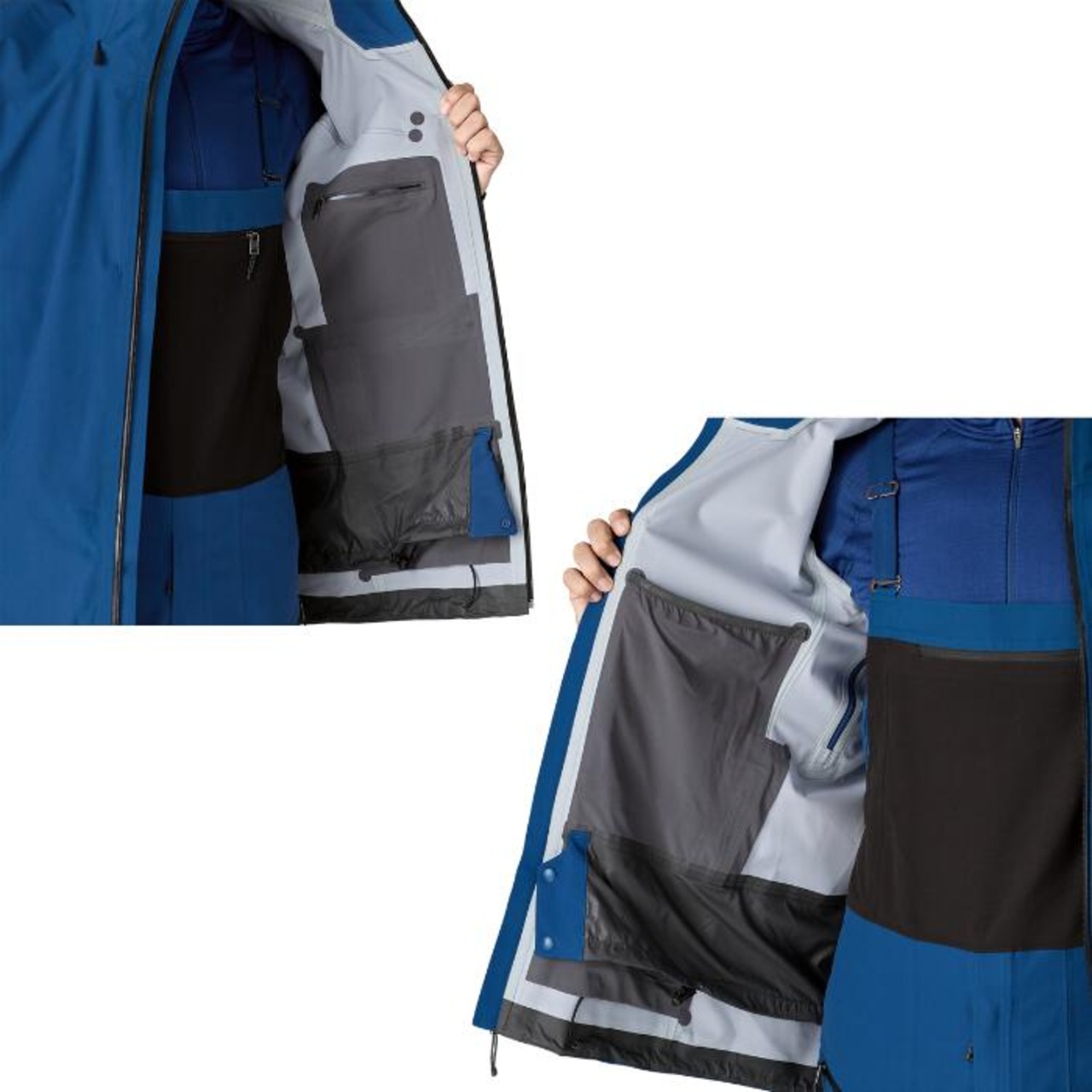 ジッパー式ハンドウォーマーポケットが2つ、ジッパー式チェストポケットが1つ(内側からアクセスでき、ミュージックプレイヤーなどのコードを通すための小穴付き)、上腕にスキーパスの収納に便利なジッパー式ポケットが1つ。内側にドロップイン型ポケットが1つ
