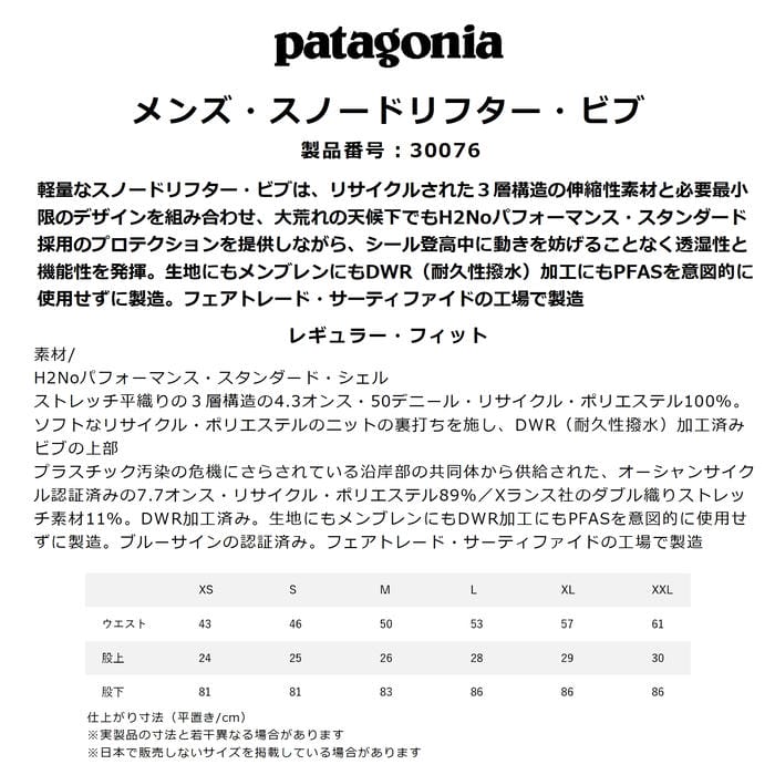 patagonia メンズ・スノードリフター・ビブ 30076 スノーパンツ レギュラーフィット 伸縮 防水 撥水 RECCOリフレクター内蔵 サイドジッパー パタゴニア 正規品