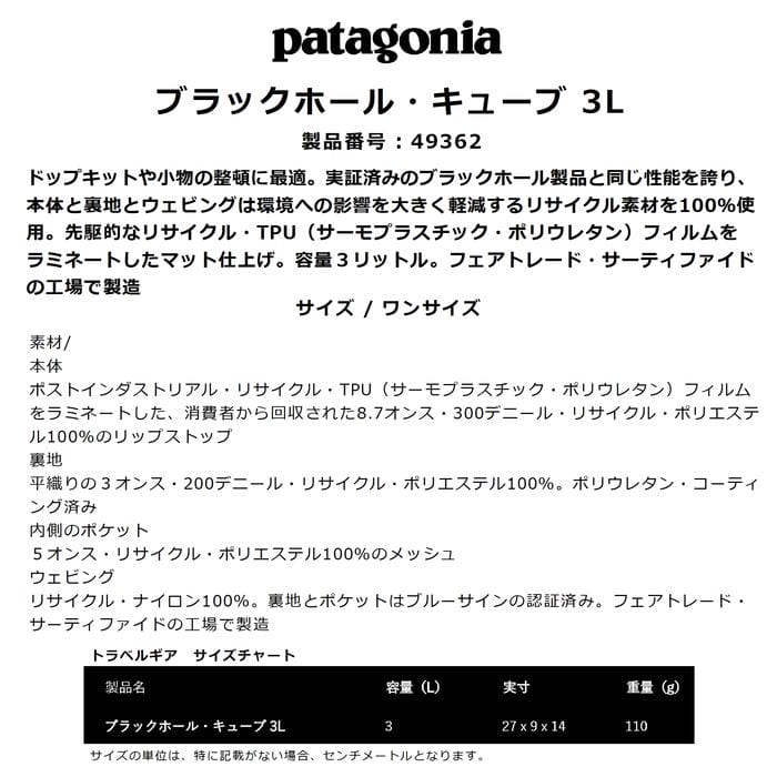 patagonia ブラックホール・キューブ 3L 49362 ポーチ パッキング オーガナイザー付き デイジーチェーン 耐食性ジッパー トラベル ロゴ パタゴニア 正規品