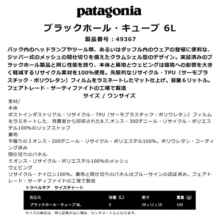 patagonia ブラックホール・キューブ 6L 49367 ポーチ パッキング デイジーチェーン 耐食性ジッパー 持ち運び用ハンドル トラベル ロゴ パタゴニア 正規品