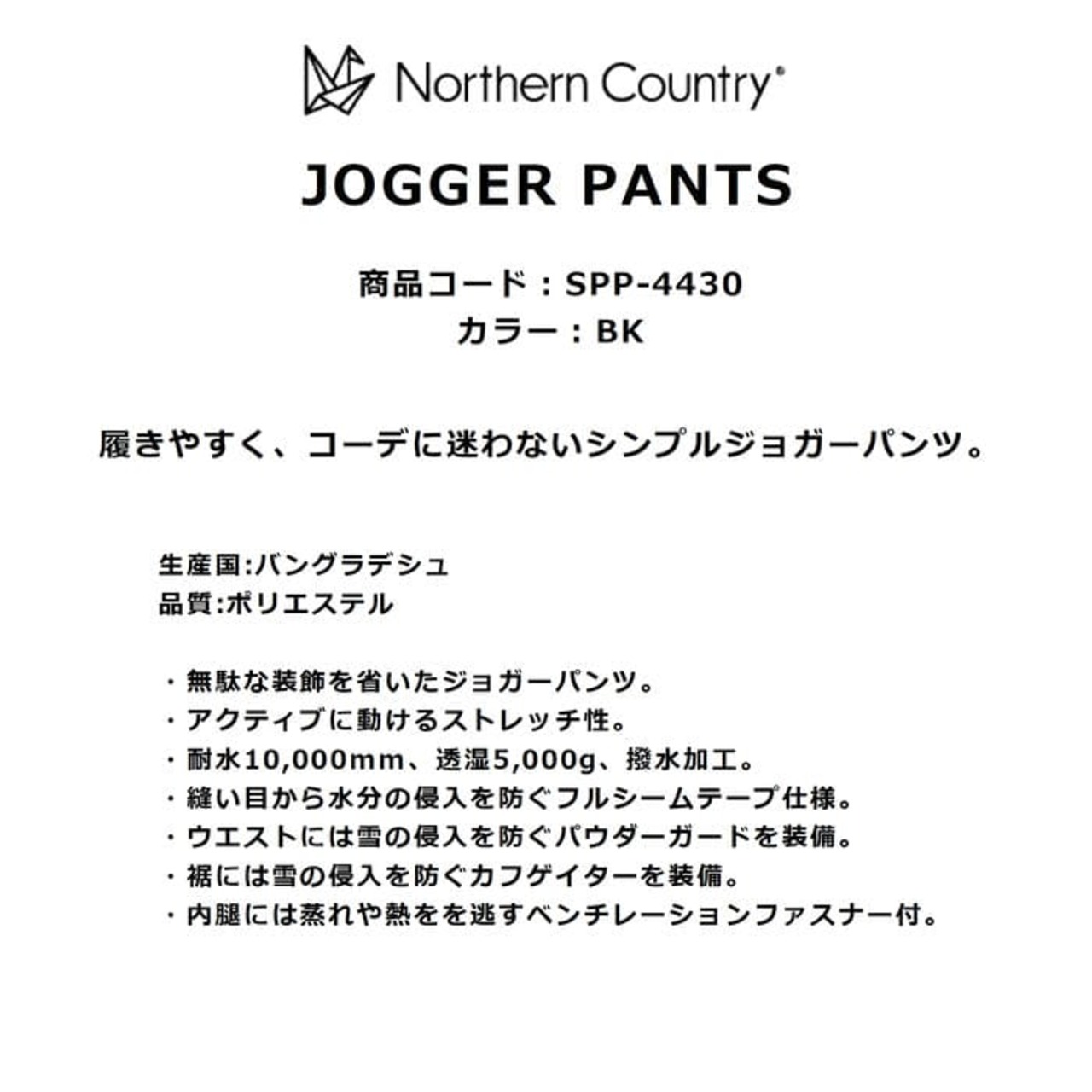 northern country JOGGER PANTS SPP-4430 スノーボードウェア パンツ ユニセックス ストレッチ 耐水 防水 撥水 透湿 パウダーガード ノーザンカントリー 正規品