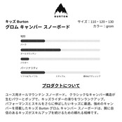 定価:35000+(税)モデルGromキャンバーサイズ110 , 120 , 130概要ユース用オールマウンテン スノーボード。 クラシックなキャンバー構造が生むパワーとポップで、キッズライダーの滑りをワンランクアップ。