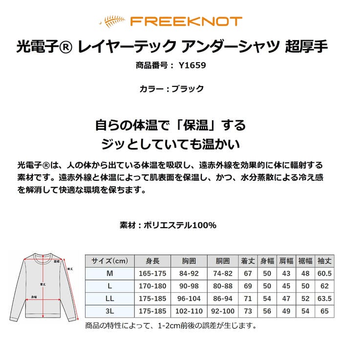 FREEKNOT 光電子 レイヤーテック アンダーシャツ 超厚手 Y1659 裏起毛構造 吸水速乾 保温 丸編み製法 静電気発生抑制 メンズ あったか下着 フリーノット 正規品