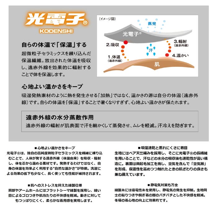 光電子は、人の体から出ている体温を吸収し、遠赤外線を効果的に体に輻射する素材です。遠赤外線と体温によって肌表面を保温し、かつ、水分蒸散による冷え感を解消して快適な環境を保ちます。特長■心地よい温かさをキープ