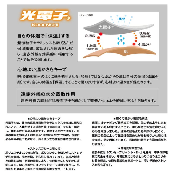 光電子は、人の体から出ている体温を吸収し、遠赤外線を効果的に体に輻射する素材です。遠赤外線と体温によって肌表面を保温し、かつ、水分蒸散による冷え感を解消して快適な環境を保ちます。特長■心地よい温かさをキープ
