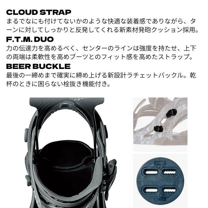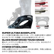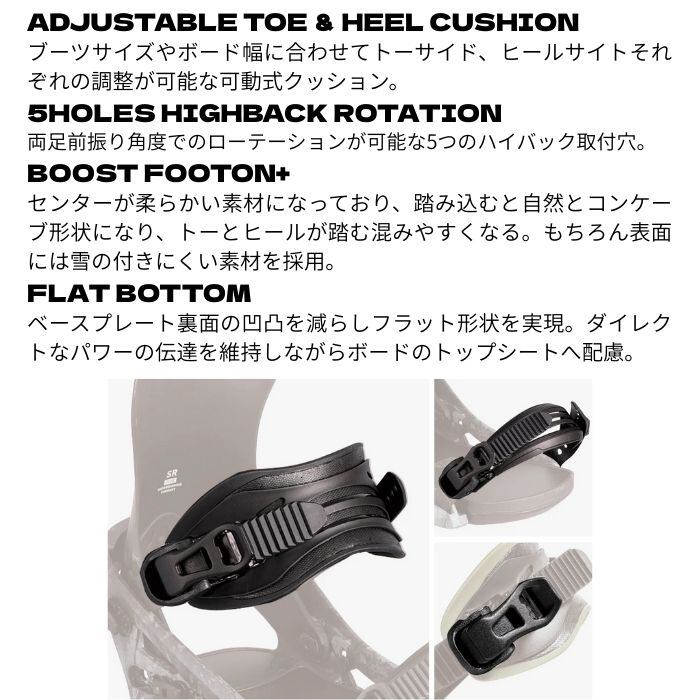 一方、内側には動きやすさを重視した柔らかで小型のスタビライザーを採用し、膝を内側にいれたり、ツリーランでの細かい動き等がしやすくなっています。この左右非対称の構造により、午前中はひたすらパウダーハントをし、無くなったら地形遊びやカービングを存分に楽しむ、そんな最高の1日をサポートするバインディングに仕上がりました。詳細※注意事項●返品について●