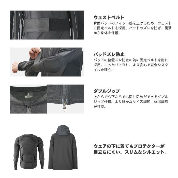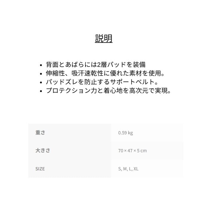 定価:18000+(税)サイズS , M , L , XLカラーBK概要・背面とあばらには2層パッドを装備。