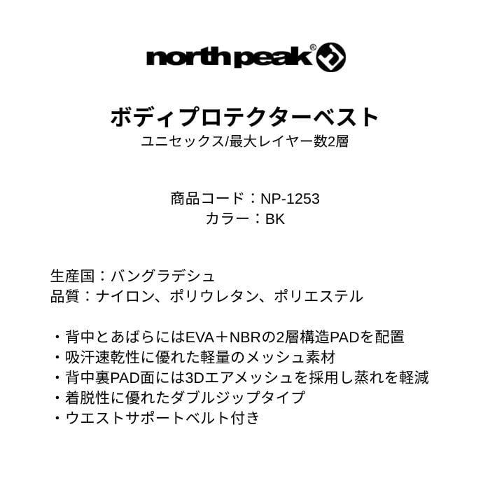 north peak ノースピーク UNISEX BODY PROTECTOR VEST ボディプロテクターベスト NP-1253 BK ユニセックス スノーボード 最大レイヤー数2層 正規品