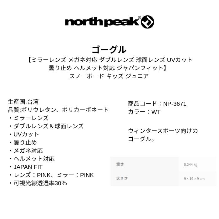 north peak ノースピーク ゴーグル スノーボード キッズ ジュニア ミラーレンズ メガネ対応 球面レンズ UVカット 曇り止め ヘルメット対応 WT NP-3671 正規品