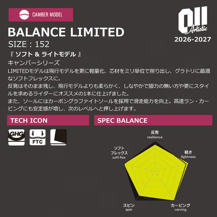 26-27 011 Artistic BALANCE LIMITED 152 ゼロワンワンアーティスティック バランス リミテッド フラットツインキャンバー グラトリ 国産 スノーボード 正規品