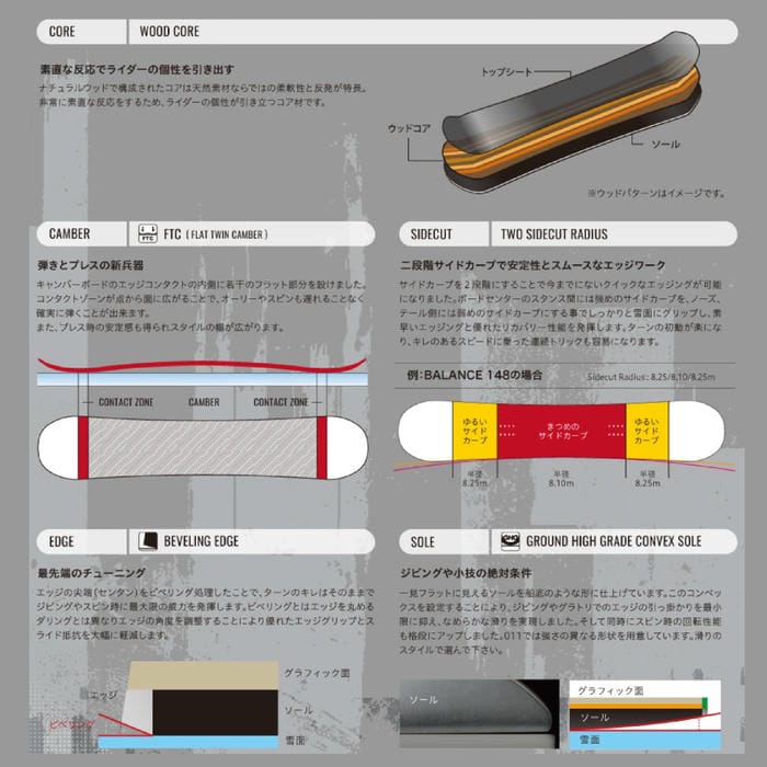 少し細めのウエストにすることでエッジの切り返しが抜群なシェイプ形状のBALANCE。26-27モデルは、コア材を見直すことで従来の「しなやかさ」と、脅威的な「粘り」が融合しました。トリックのキレを増す為に2段階のサイドカーブを採用。ボードセンターは強めに、スタンスの外側に向けては緩めのサイドカーブにすることで切り返しが非常に軽くなり、技のキレとカービングが格段にアップしました。