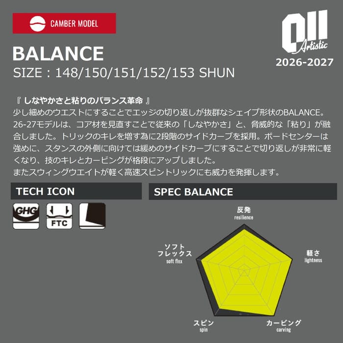 26-27 011 Artistic BALANCE 148/150/151/152/153 SHUN ゼロワンワンアーティスティック バランス フラットツインキャンバー グラトリ 国産 スノーボード 正規品