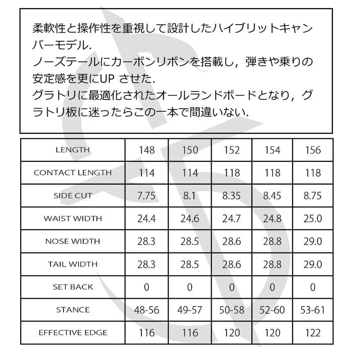 定価:90000+(税)サイズ148 , 150 , 152 , 154 , 156モデルMANTIS商品説明柔軟性と操作性を重視して設計したハイブリットキャンバーモデル.