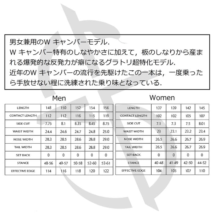定価:90000+(税)サイズ137 , 139 , 142 , 145 , 148 , 150 , 152 , 154 , 156モデルWORM商品説明しなやかなフレックスで汎用性の高いキャンバーモデル.柔軟性のあるしなりはそのままにノーズ,テールにカーボンリボンを搭載した事により反発力が強化された.